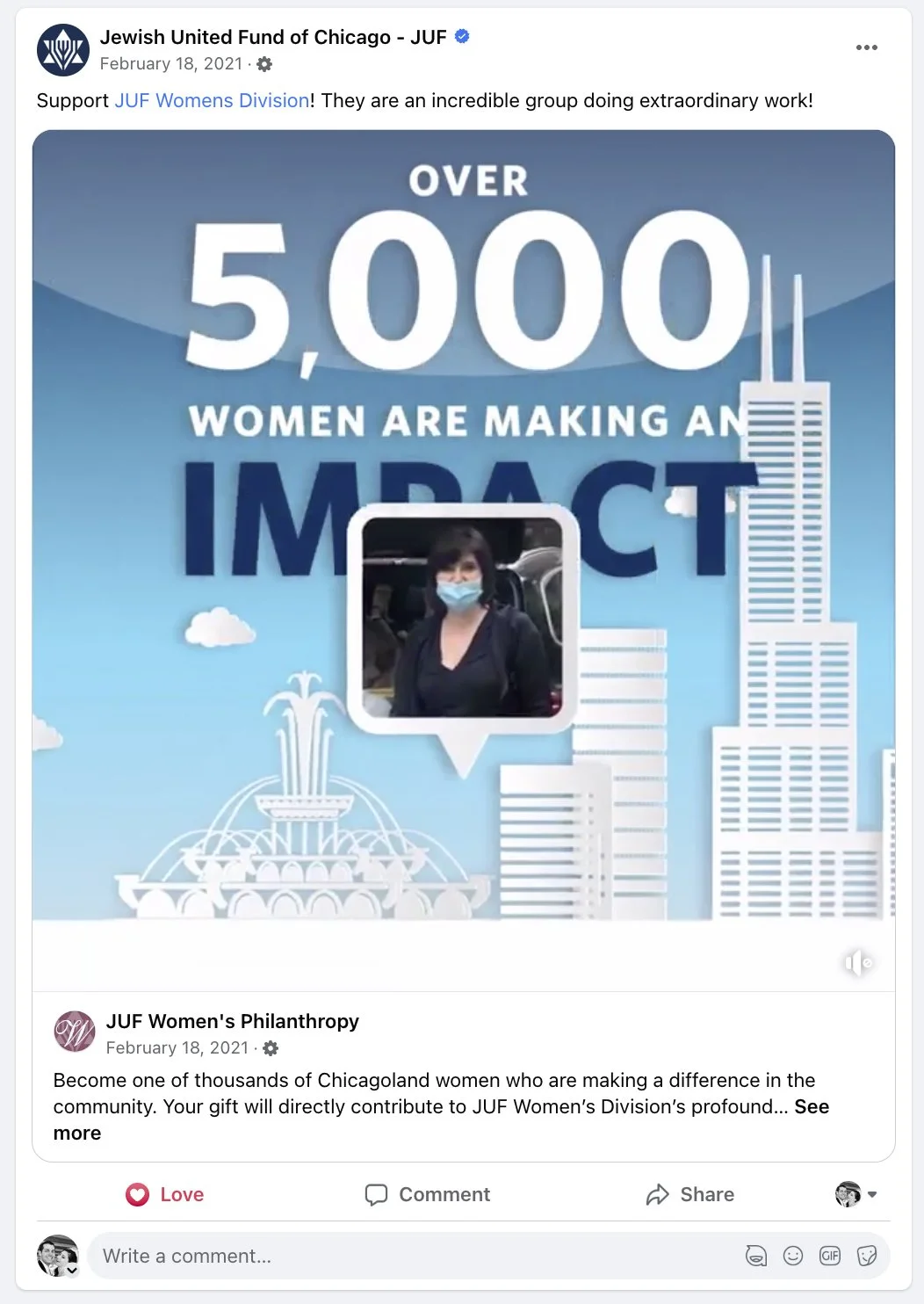 The JUF Women’s Philanthropy (previously Women’s Division) is an organization within the Jewish United Fund whose members are from around Chicago and the greater Chicago area. This group of dedicated women make a tremendous impact within the community and support causes not limited to women’s issues. The goal of this assignment was to spread the word and recruit new members for Women’s Philanthropy. To do this, we created a video using motion graphics to display the large number of women who are already making an impact from the city to the suburbs. We intertwined images of these women within a mixture of recognizable Chicago and suburban landmarks in a “paper pop up” carousel motion.